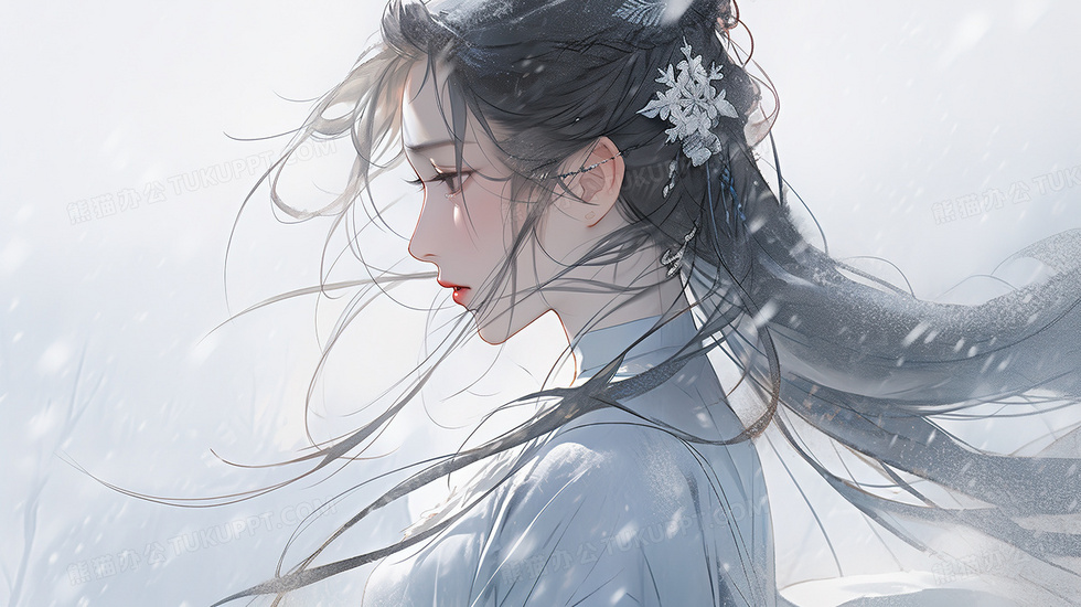 本作品内容为唯美古风冬日雪景中的少女创意插画, 格式为 jpg, 大小7 MB, 图片尺寸为2912 x 1632, 源文件无水印, 欢迎使用熊猫办公。 如认为平台内容涉嫌侵权,可通过邮件:tousu@tukuppt.com提出书面通知,我们将及时处理。