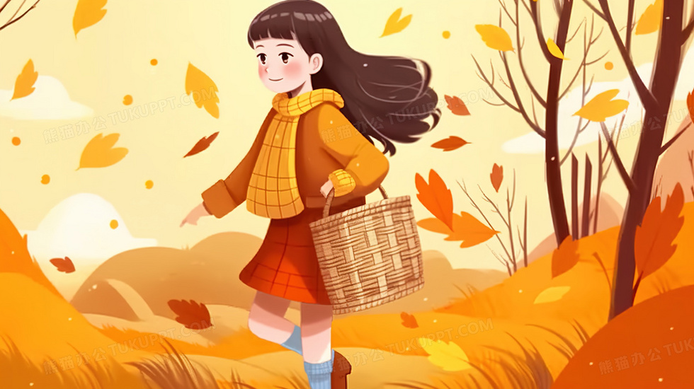 本作品内容为秋天金色落叶纷飞的树林里拿着篮子的小女孩插画, 格式为 jpg, 大小5 MB, 图片尺寸为2912 x 1632, 源文件无水印, 欢迎使用熊猫办公。 如认为平台内容涉嫌侵权,可通过邮件:tousu@tukuppt.com提出书面通知,我们将及时处理。