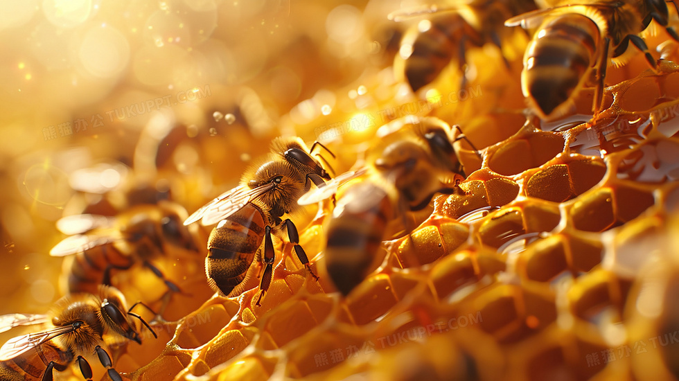 本作品内容为蜂巢上的蜜蜂酿蜜特写插画, 格式为 jpg, 大小3 MB, 图片尺寸为2912 x 1632, 源文件无水印, 欢迎使用熊猫办公。 如认为平台内容涉嫌侵权,可通过邮件:tousu@tukuppt.com提出书面通知,我们将及时处理。