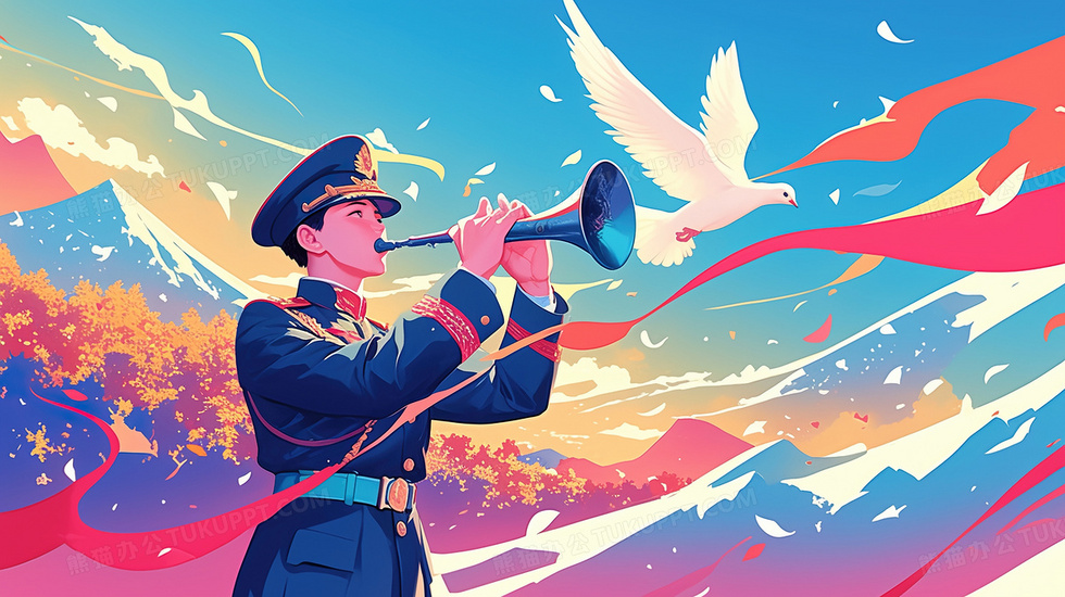 本作品内容为国庆节军人吹响军号庆祝插画, 格式为 jpg, 大小3 MB, 图片尺寸为2912 x 1632, 源文件无水印, 欢迎使用熊猫办公。 如认为平台内容涉嫌侵权,可通过邮件:tousu@tukuppt.com提出书面通知,我们将及时处理。