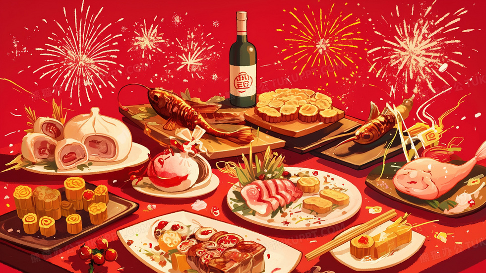 本作品内容为春节年夜饭丰富美食烟花插画, 格式为 jpg, 大小3 MB, 图片尺寸为2912 x 1632, 源文件无水印, 欢迎使用熊猫办公。 如认为平台内容涉嫌侵权,可通过邮件:tousu@tukuppt.com提出书面通知,我们将及时处理。