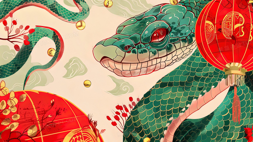 本作品内容为蛇年水墨灯笼花卉与青蛇插画, 格式为 jpg, 大小4 MB, 图片尺寸为2912 x 1632, 源文件无水印, 欢迎使用熊猫办公。 如认为平台内容涉嫌侵权,可通过邮件:tousu@tukuppt.com提出书面通知,我们将及时处理。