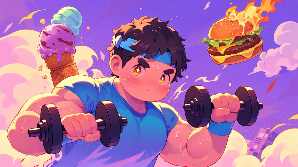 本作品内容为戒掉不健康饮食举哑铃运动减肥的男子插画, 格式为 jpg, 大小3 MB, 图片尺寸为2912 x 1632, 源文件无水印, 欢迎使用熊猫办公。 如认为平台内容涉嫌侵权,可通过邮件:tousu@tukuppt.com提出书面通知,我们将及时处理。