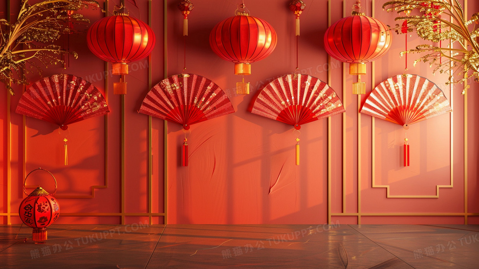 本作品内容为红色春节喜庆扇子装饰背景, 格式为 jpg, 大小2 MB, 图片尺寸为1456 x 816, 作品中背景图片无需修改, 源文件无水印,可以直接使用, 欢迎使用熊猫办公。 如认为平台内容涉嫌侵权,可通过邮件:tousu@tukuppt.com提出书面通知,我们将及时处理。