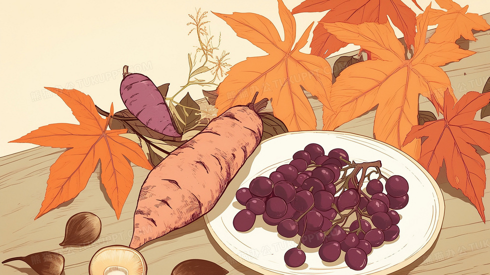 本作品内容为手绘秋天食物红薯板栗葡萄插画, 格式为 jpg, 大小3 MB, 图片尺寸为2912 x 1632, 源文件无水印, 欢迎使用熊猫办公。 如认为平台内容涉嫌侵权,可通过邮件:tousu@tukuppt.com提出书面通知,我们将及时处理。