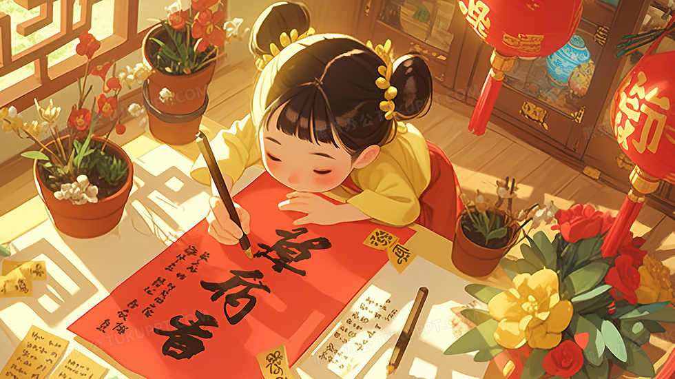 本作品内容为新年写对联的可爱小女孩插画, 格式为 jpg, 大小3 MB, 图片尺寸为2912 x 1632, 源文件无水印, 欢迎使用熊猫办公。 如认为平台内容涉嫌侵权,可通过邮件:tousu@tukuppt.com提出书面通知,我们将及时处理。