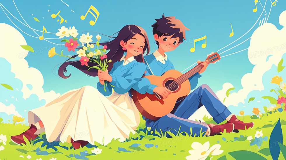 本作品内容为坐草地背靠背弹吉他的情侣插画, 格式为 jpg, 大小3 MB, 图片尺寸为2912 x 1632, 源文件无水印, 欢迎使用熊猫办公。 如认为平台内容涉嫌侵权,可通过邮件:tousu@tukuppt.com提出书面通知,我们将及时处理。