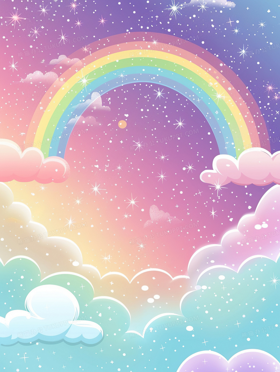 本作品内容为卡通彩虹梦幻背景, 格式为 jpg, 大小3 MB, 图片尺寸为1856 x 2464, 作品中背景图片无需修改, 源文件无水印,可以直接使用, 欢迎使用熊猫办公。 如认为平台内容涉嫌侵权,可通过邮件:tousu@tukuppt.com提出书面通知,我们将及时处理。