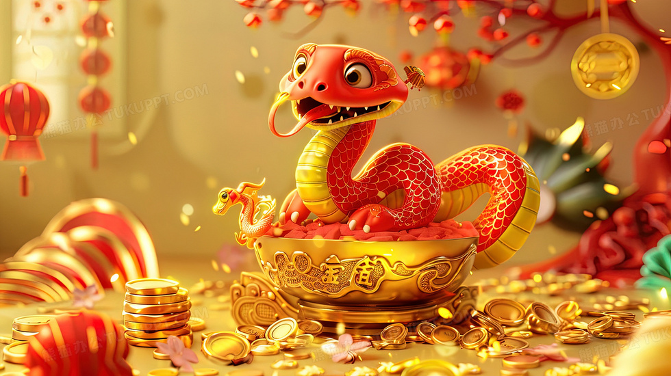 本作品内容为3D春节蛇年金元宝聚宝盆上的蛇插画, 格式为 jpg, 大小3 MB, 图片尺寸为2912 x 1632, 源文件无水印, 欢迎使用熊猫办公。 如认为平台内容涉嫌侵权,可通过邮件:tousu@tukuppt.com提出书面通知,我们将及时处理。