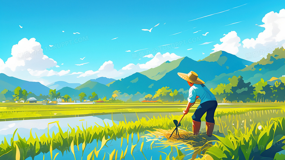本作品内容为农民水稻田插秧劳作农业插画, 格式为 jpg, 大小3 MB, 图片尺寸为2912 x 1632, 源文件无水印, 欢迎使用熊猫办公。 如认为平台内容涉嫌侵权,可通过邮件:tousu@tukuppt.com提出书面通知,我们将及时处理。