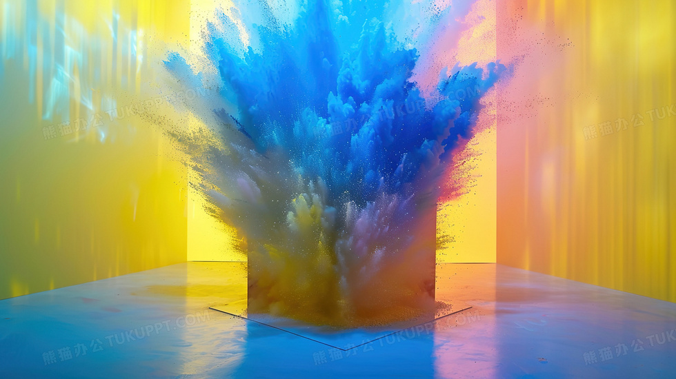 本作品内容为黄蓝渐变飞溅粉末简约背景, 格式为 jpg, 大小3 MB, 图片尺寸为2912 x 1632, 作品中背景图片无需修改, 源文件无水印,可以直接使用, 欢迎使用熊猫办公。 如认为平台内容涉嫌侵权,可通过邮件:tousu@tukuppt.com提出书面通知,我们将及时处理。