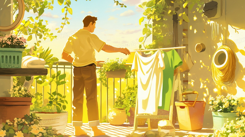 本作品内容为阳台晾晒衣服的男子插画, 格式为 jpg, 大小3 MB, 图片尺寸为2912 x 1632, 源文件无水印, 欢迎使用熊猫办公。 如认为平台内容涉嫌侵权,可通过邮件:tousu@tukuppt.com提出书面通知,我们将及时处理。
