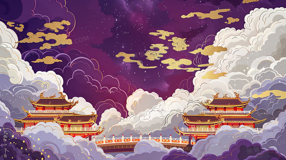 本作品内容为紫色描金中式建筑云朵插画, 格式为 jpg, 大小3 MB, 图片尺寸为2912 x 1632, 源文件无水印, 欢迎使用熊猫办公。 如认为平台内容涉嫌侵权,可通过邮件:tousu@tukuppt.com提出书面通知,我们将及时处理。