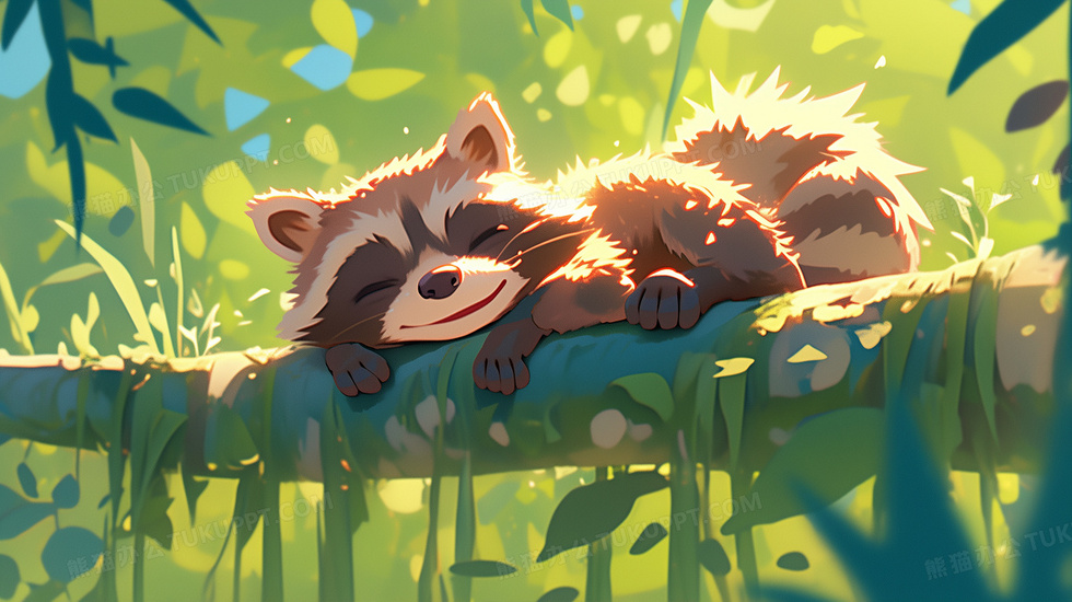 本作品内容为一只可爱的小浣熊趴在树上美滋滋的酣睡插画, 格式为 jpg, 大小7 MB, 图片尺寸为2912 x 1632, 源文件无水印, 欢迎使用熊猫办公。 如认为平台内容涉嫌侵权,可通过邮件:tousu@tukuppt.com提出书面通知,我们将及时处理。