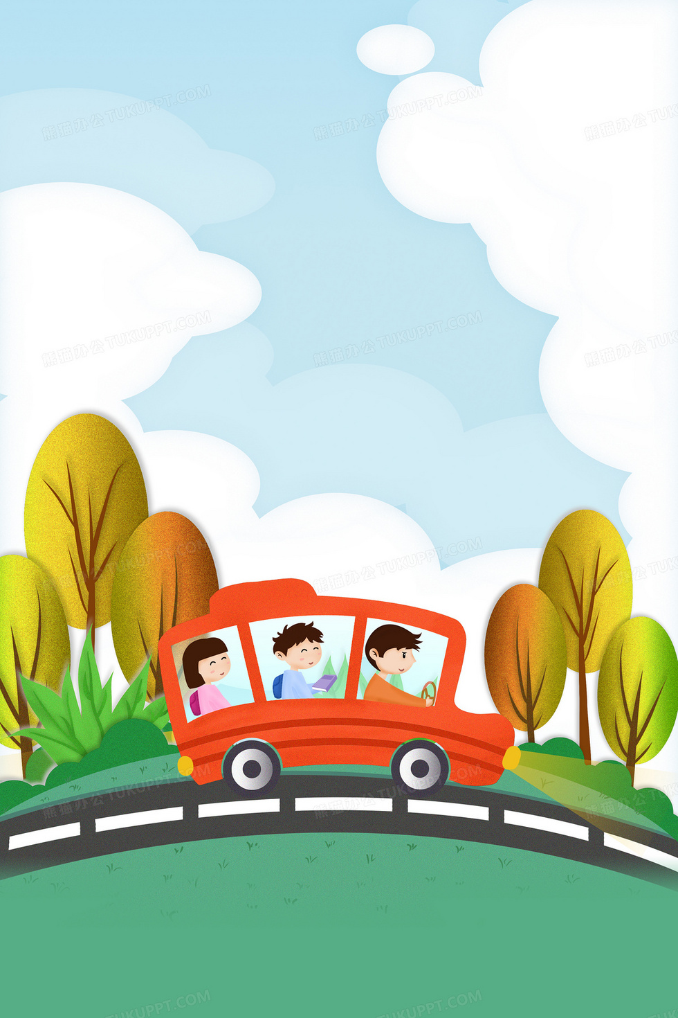 本作品内容为手绘卡通风开学季校车背景, 格式为 psd, 大小65 MB, 图片尺寸为3543 x 5315, 作品中背景图片无需修改, 源文件无水印,可以直接使用, 欢迎使用熊猫办公。 如认为平台内容涉嫌侵权,可通过邮件:tousu@tukuppt.com提出书面通知,我们将及时处理。