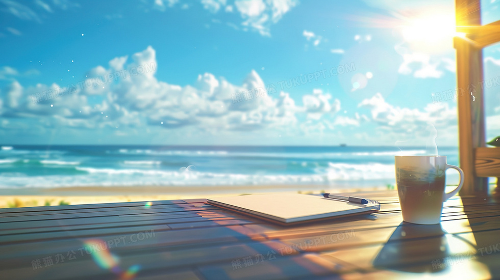 本作品内容为海边木桌上的笔记本与咖啡插画, 格式为 jpg, 大小2 MB, 图片尺寸为2912 x 1632, 源文件无水印, 欢迎使用熊猫办公。 如认为平台内容涉嫌侵权,可通过邮件:tousu@tukuppt.com提出书面通知,我们将及时处理。