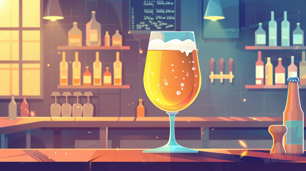 本作品内容为酒吧桌面上的一杯啤酒插画, 格式为 jpg, 大小2 MB, 图片尺寸为2912 x 1632, 源文件无水印, 欢迎使用熊猫办公。 如认为平台内容涉嫌侵权,可通过邮件:tousu@tukuppt.com提出书面通知,我们将及时处理。