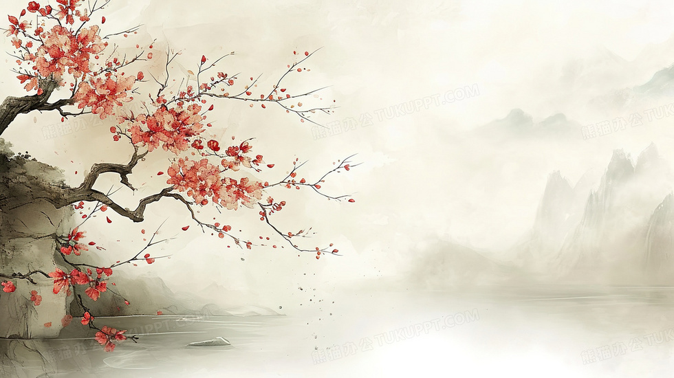 本作品内容为山岩上盛开的红梅花山水插画, 格式为 jpg, 大小3 MB, 图片尺寸为2912 x 1632, 源文件无水印, 欢迎使用熊猫办公。 如认为平台内容涉嫌侵权,可通过邮件:tousu@tukuppt.com提出书面通知,我们将及时处理。