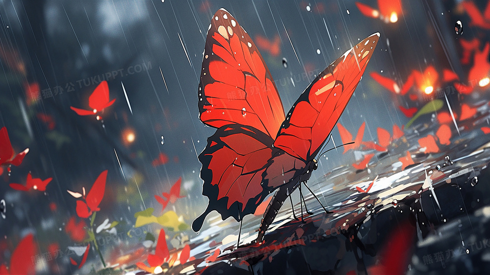 本作品内容为雨中红色花间飞舞的红色蝴蝶插画, 格式为 jpg, 大小3 MB, 图片尺寸为2912 x 1632, 源文件无水印, 欢迎使用熊猫办公。 如认为平台内容涉嫌侵权,可通过邮件:tousu@tukuppt.com提出书面通知,我们将及时处理。