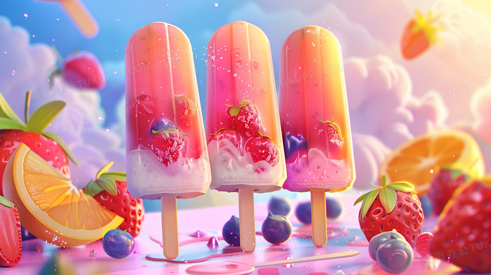本作品内容为色彩艳丽的水果冰棒雪糕插画, 格式为 jpg, 大小3 MB, 图片尺寸为2912 x 1632, 源文件无水印, 欢迎使用熊猫办公。 如认为平台内容涉嫌侵权,可通过邮件:tousu@tukuppt.com提出书面通知,我们将及时处理。