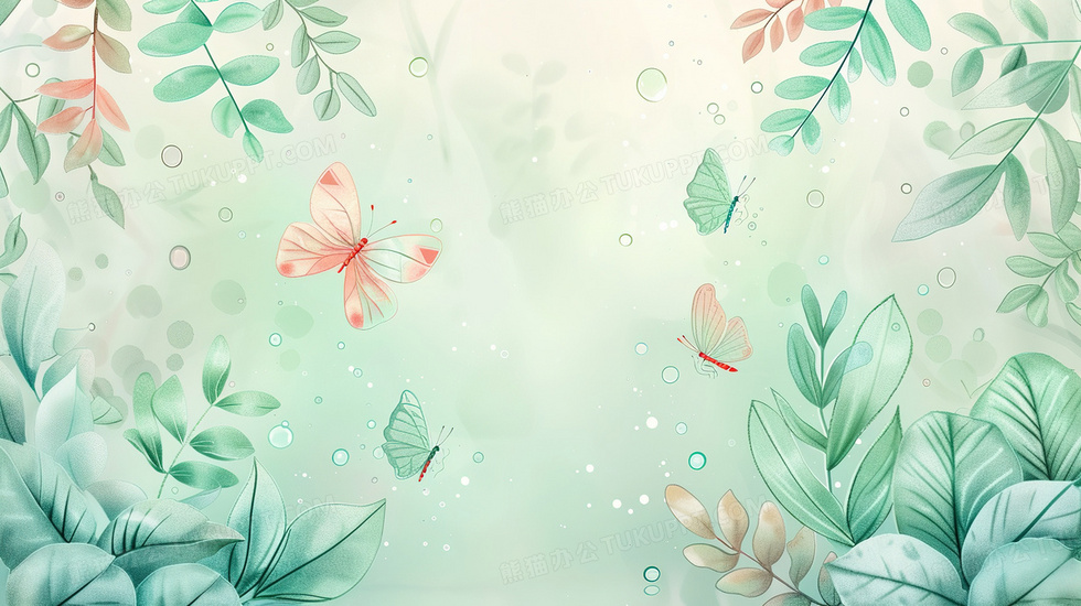 本作品内容为绿色手绘小清新植物蝴蝶装饰背景, 格式为 jpg, 大小3 MB, 图片尺寸为2912 x 1632, 作品中背景图片无需修改, 源文件无水印,可以直接使用, 欢迎使用熊猫办公。 如认为平台内容涉嫌侵权,可通过邮件:tousu@tukuppt.com提出书面通知,我们将及时处理。