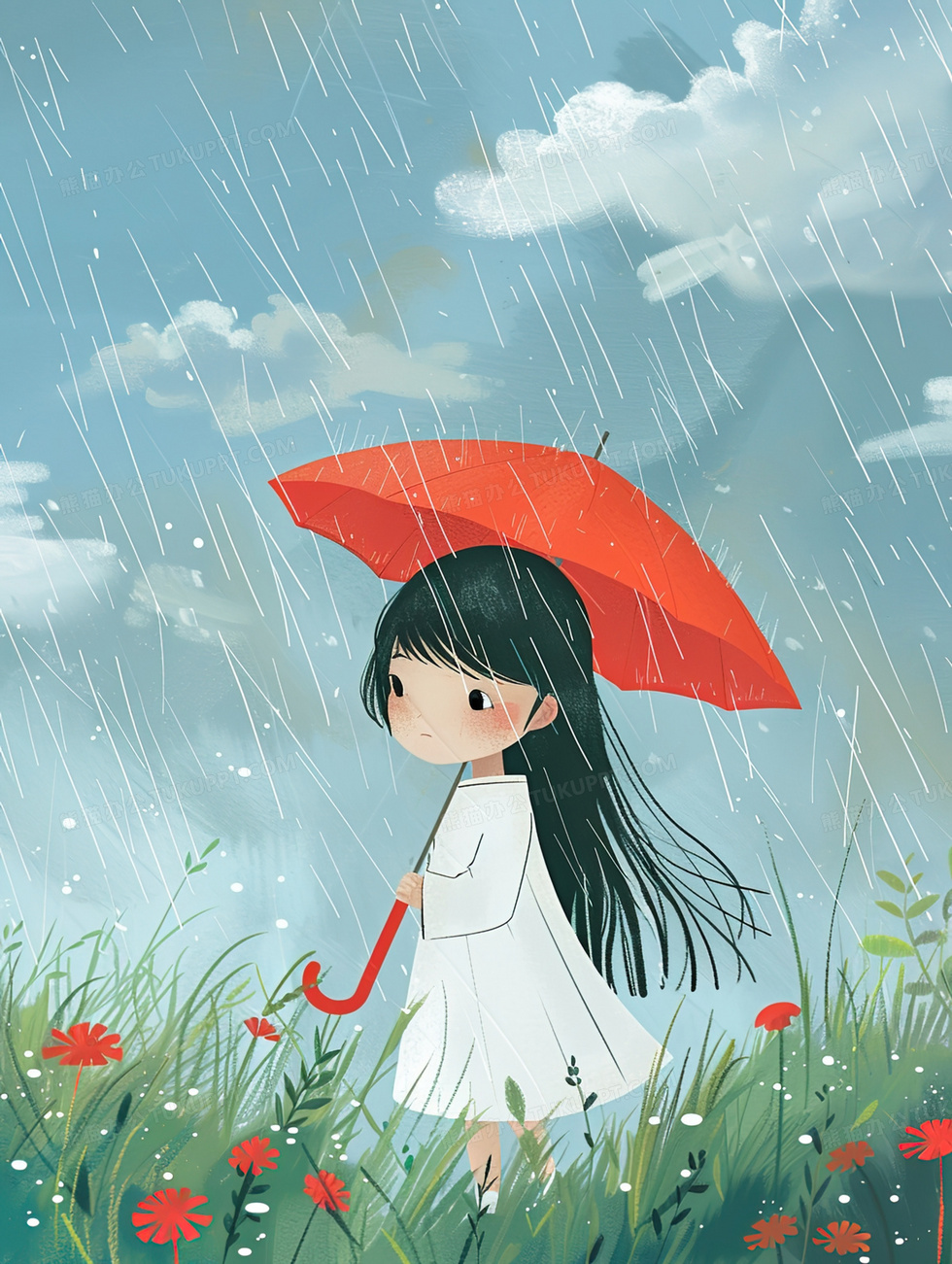 首页 > 插画 > 科技艺术 > 水彩手绘 > 夏天雨季草地撑伞的小女孩插画