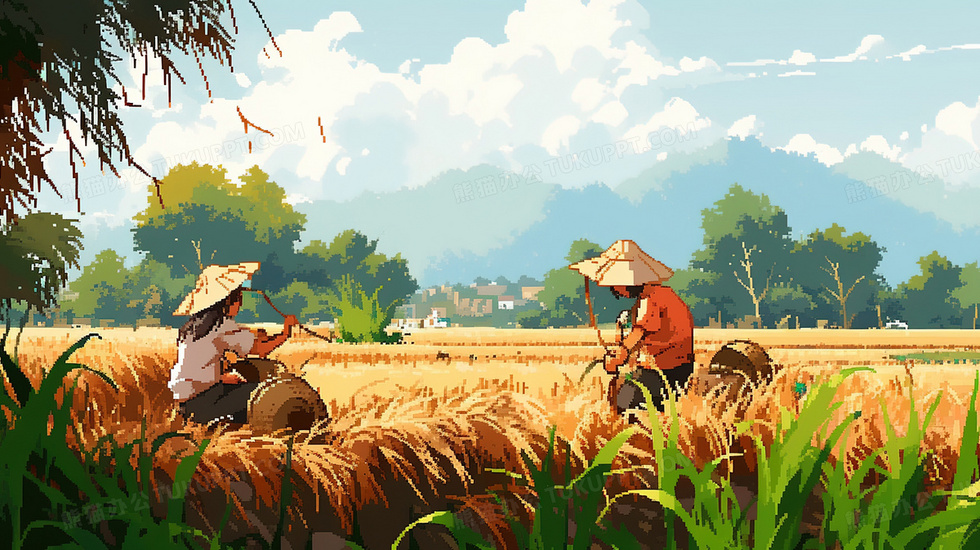 本作品内容为稻田里忙秋收的的农民插画, 格式为 jpg, 大小3 MB, 图片尺寸为2912 x 1632, 源文件无水印, 欢迎使用熊猫办公。 如认为平台内容涉嫌侵权,可通过邮件:tousu@tukuppt.com提出书面通知,我们将及时处理。