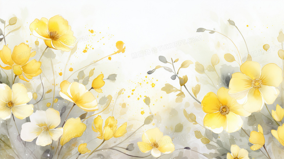 本作品内容为黄色花朵和灰绿色叶子装饰插画, 格式为 jpg, 大小2 MB, 图片尺寸为2912 x 1632, 源文件无水印, 欢迎使用熊猫办公。 如认为平台内容涉嫌侵权,可通过邮件:tousu@tukuppt.com提出书面通知,我们将及时处理。