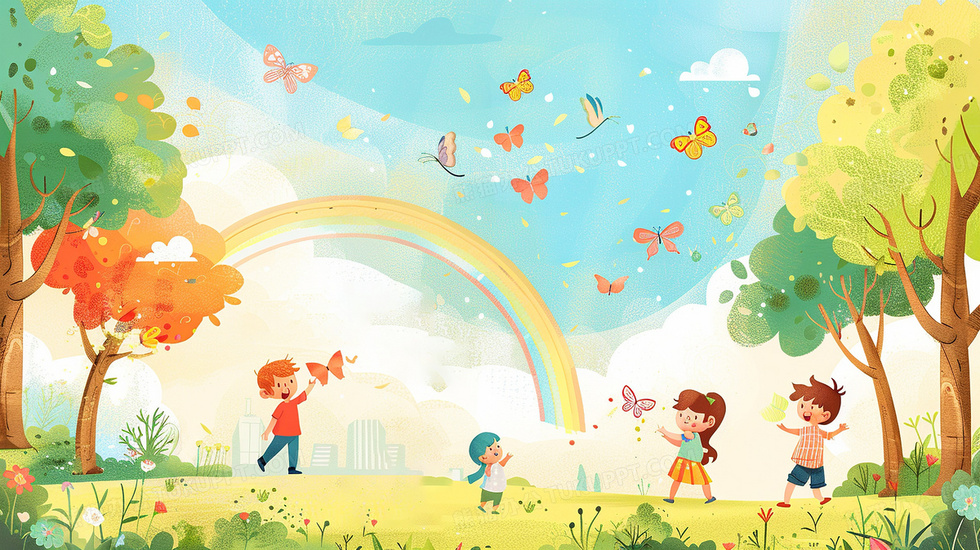 本作品内容为几个孩子儿童节在彩虹下花园里面草地上捉蝴蝶插画, 格式为 jpg, 大小4 MB, 图片尺寸为2912 x 1632, 源文件无水印, 欢迎使用熊猫办公。 如认为平台内容涉嫌侵权,可通过邮件:tousu@tukuppt.com提出书面通知,我们将及时处理。