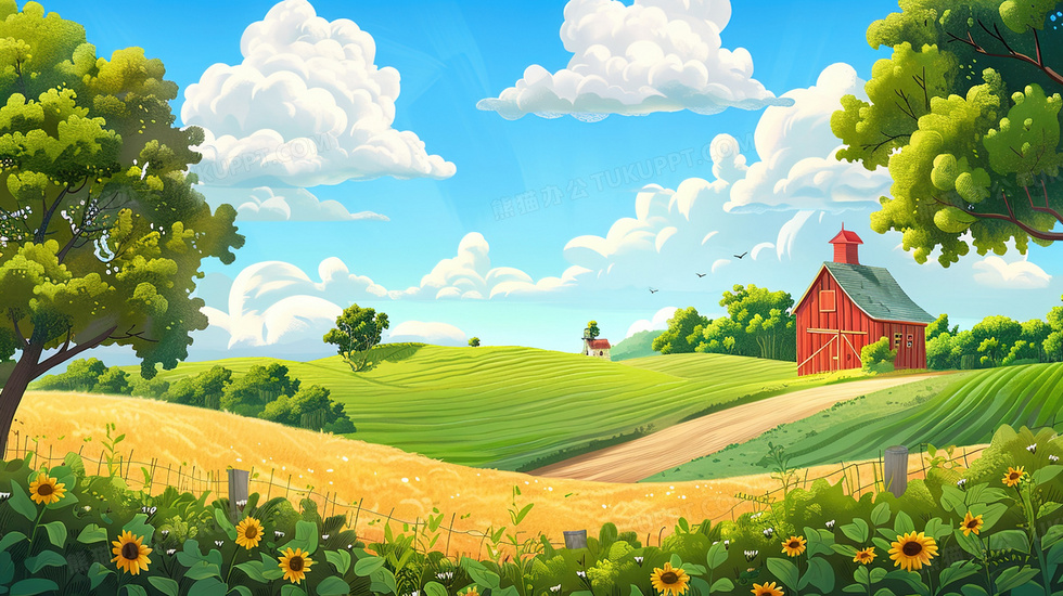 本作品内容为蓝天农场田野风景插画, 格式为 jpg, 大小3 MB, 图片尺寸为2912 x 1632, 源文件无水印, 欢迎使用熊猫办公。 如认为平台内容涉嫌侵权,可通过邮件:tousu@tukuppt.com提出书面通知,我们将及时处理。