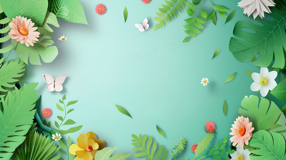本作品内容为清新剪纸风春天花草背景, 格式为 jpg, 大小3 MB, 图片尺寸为2912 x 1632, 作品中背景图片无需修改, 源文件无水印,可以直接使用, 欢迎使用熊猫办公。 如认为平台内容涉嫌侵权,可通过邮件:tousu@tukuppt.com提出书面通知,我们将及时处理。