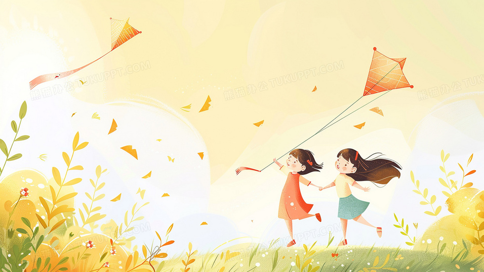 本作品内容为黄色背景下两个孩子在草地上放风筝插画, 格式为 jpg, 大小2 MB, 图片尺寸为2912 x 1632, 源文件无水印, 欢迎使用熊猫办公。 如认为平台内容涉嫌侵权,可通过邮件:tousu@tukuppt.com提出书面通知,我们将及时处理。