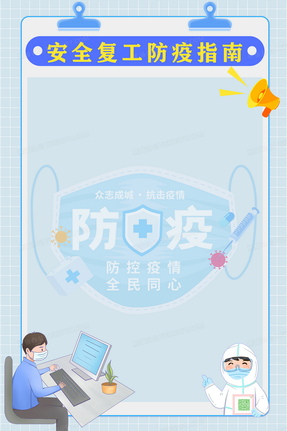 本作品内容为安全复工防疫边框背景, 格式为 psd, 大小8 MB, 图片尺寸为3543 x 5315, 作品中背景图片无需修改, 源文件无水印,可以直接使用, 欢迎使用熊猫办公。 如认为平台内容涉嫌侵权,可通过邮件:tousu@tukuppt.com提出书面通知,我们将及时处理。