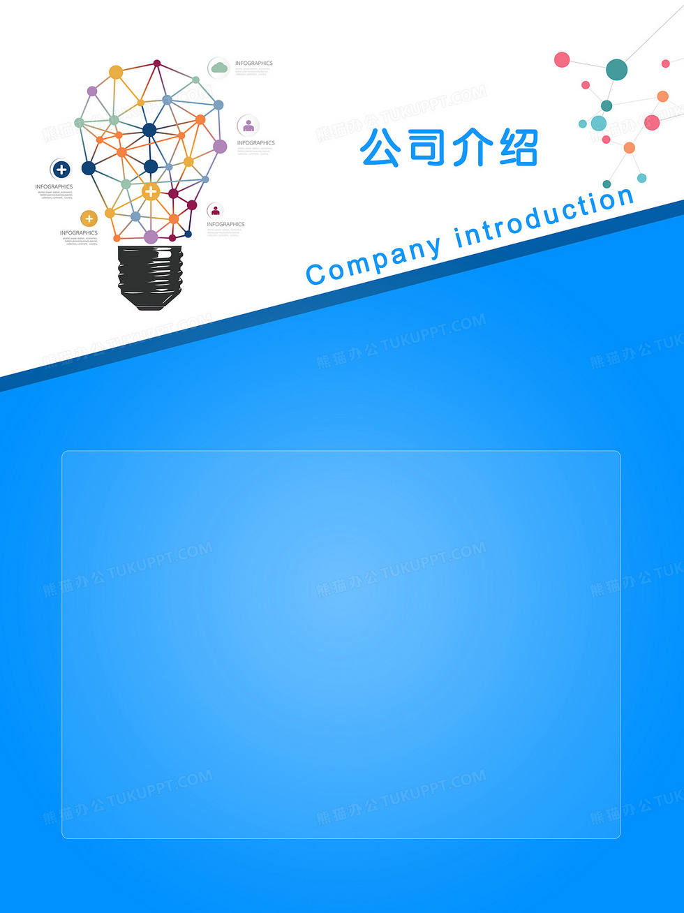 本作品内容为公司介绍海报背景, 格式为 psd, 图片尺寸为5292 x 7064, 作品中背景图片无需修改, 源文件无水印,可以直接使用, 欢迎使用熊猫办公。 如认为平台内容涉嫌侵权,可通过邮件:tousu@tukuppt.com提出书面通知,我们将及时处理。