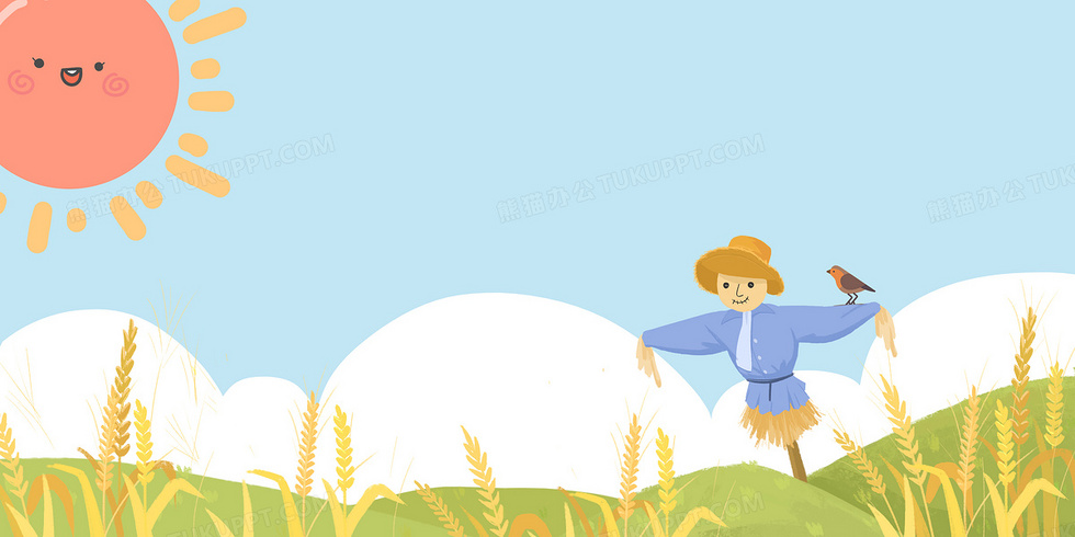 本作品内容为卡通可爱的手绘稻草人背景, 格式为 psd, 大小7 MB, 图片尺寸为4724 x 2362, 作品中背景图片无需修改, 源文件无水印,可以直接使用, 欢迎使用熊猫办公。 如认为平台内容涉嫌侵权,可通过邮件:tousu@tukuppt.com提出书面通知,我们将及时处理。