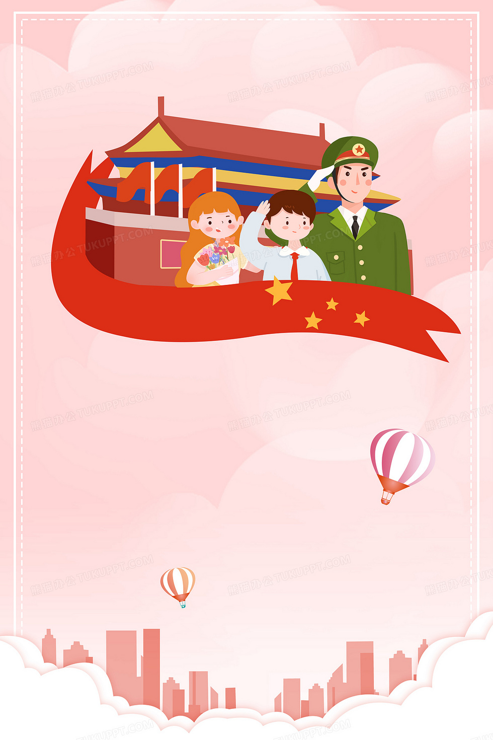 本作品内容为党建卡通国庆节建军节通用背景, 格式为 psd, 大小18 MB, 图片尺寸为7087 x 10630, 作品中背景图片无需修改, 源文件无水印,可以直接使用, 欢迎使用熊猫办公。 如认为平台内容涉嫌侵权,可通过邮件:tousu@tukuppt.com提出书面通知,我们将及时处理。