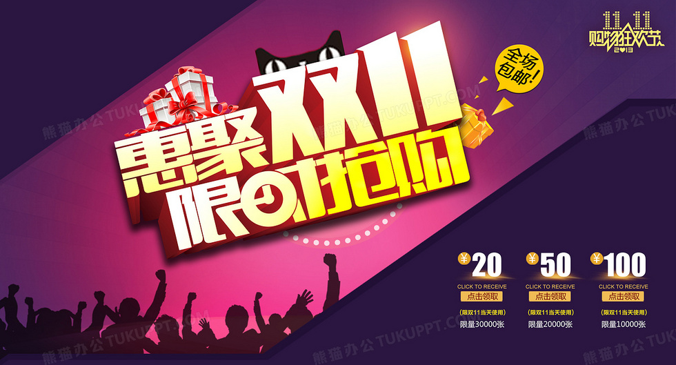 本作品内容为天猫淘宝双十一海报, 格式为 psd, 图片尺寸为4361 x 2356, 作品中背景图片无需修改, 源文件无水印,可以直接使用, 欢迎使用熊猫办公。 如认为平台内容涉嫌侵权,可通过邮件:tousu@tukuppt.com提出书面通知,我们将及时处理。