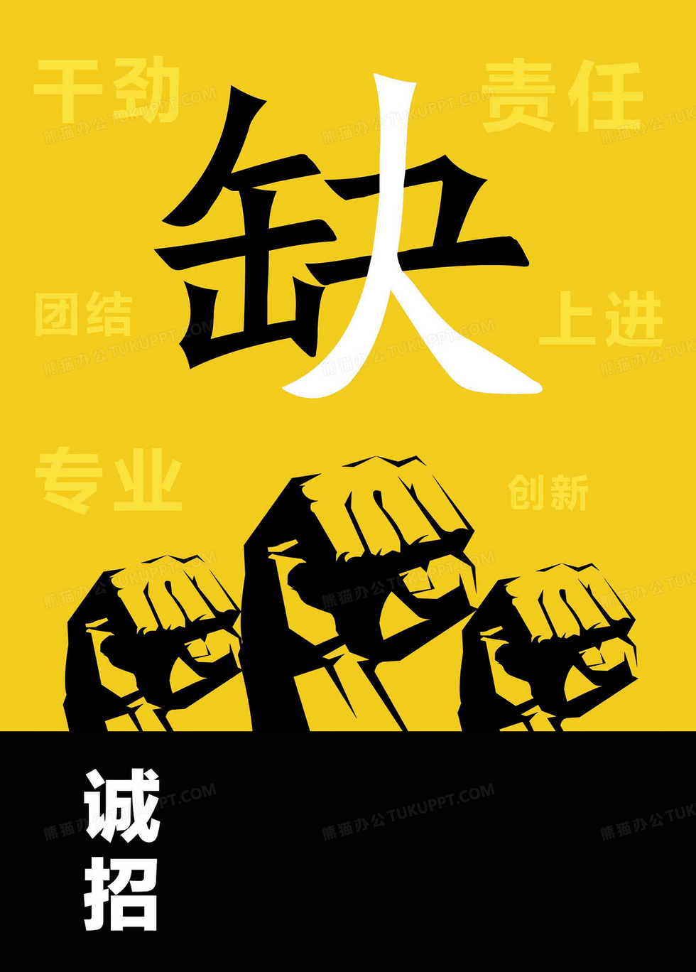 本作品内容为招聘人才缺人拳头力量诚招黄色海报, 格式为 psd, 图片尺寸为2598 x 3626, 作品中背景图片无需修改, 源文件无水印,可以直接使用, 欢迎使用熊猫办公。 如认为平台内容涉嫌侵权,可通过邮件:tousu@tukuppt.com提出书面通知,我们将及时处理。
