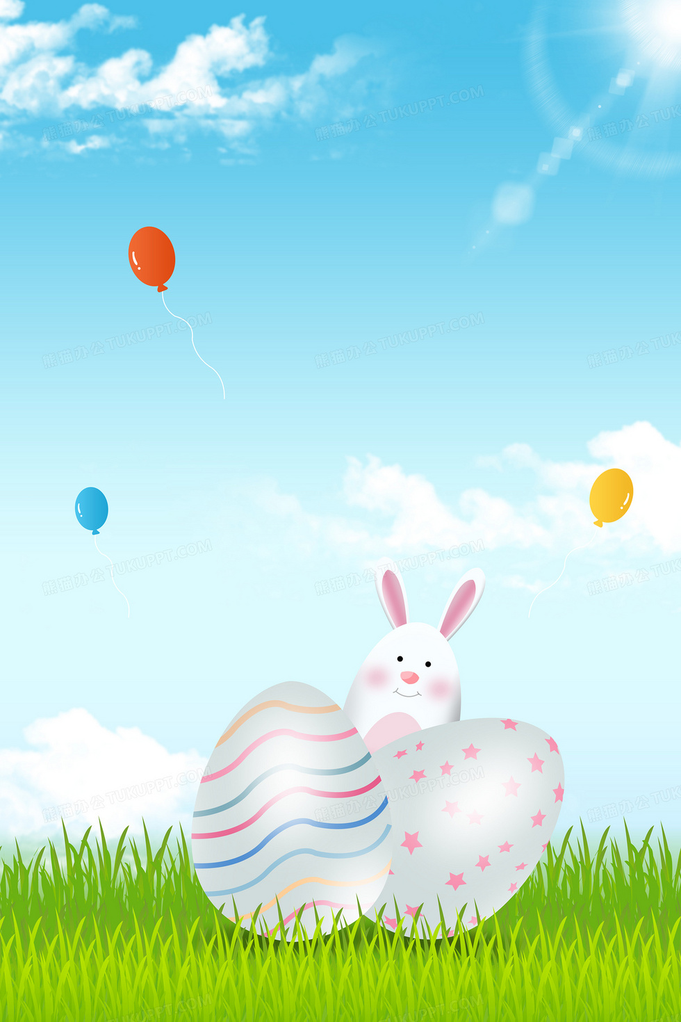 本作品内容为复活节彩蛋兔子草地蓝天背景, 格式为 psd, 大小21 MB, 图片尺寸为3543 x 5315, 作品中背景图片无需修改, 源文件无水印,可以直接使用, 欢迎使用熊猫办公。 如认为平台内容涉嫌侵权,可通过邮件:tousu@tukuppt.com提出书面通知,我们将及时处理。