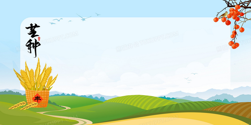 本作品内容为二十四节气芒种丰收简约背景, 格式为 psd, 大小16 MB, 图片尺寸为4724 x 2362, 作品中背景图片无需修改, 源文件无水印,可以直接使用, 欢迎使用熊猫办公。 如认为平台内容涉嫌侵权,可通过邮件:tousu@tukuppt.com提出书面通知,我们将及时处理。