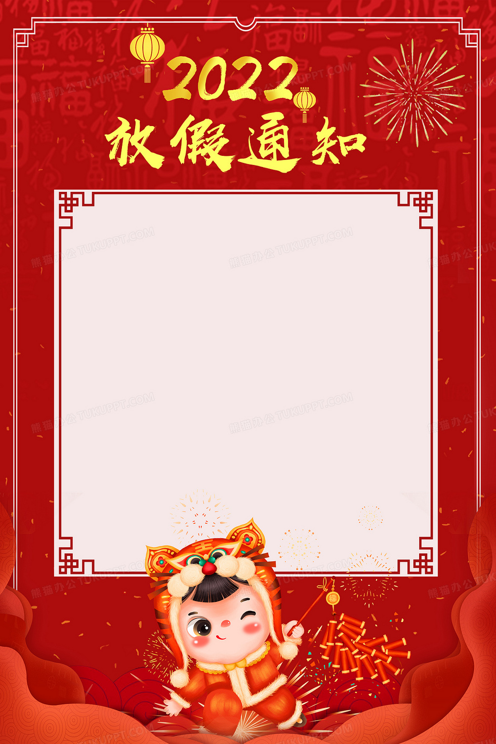 本作品内容为红色喜庆中国风虎年放假通知宣传背景, 格式为 psd, 大小121 MB, 图片尺寸为7087 x 10630, 作品中背景图片无需修改, 源文件无水印,可以直接使用, 欢迎使用熊猫办公。 如认为平台内容涉嫌侵权,可通过邮件:tousu@tukuppt.com提出书面通知,我们将及时处理。