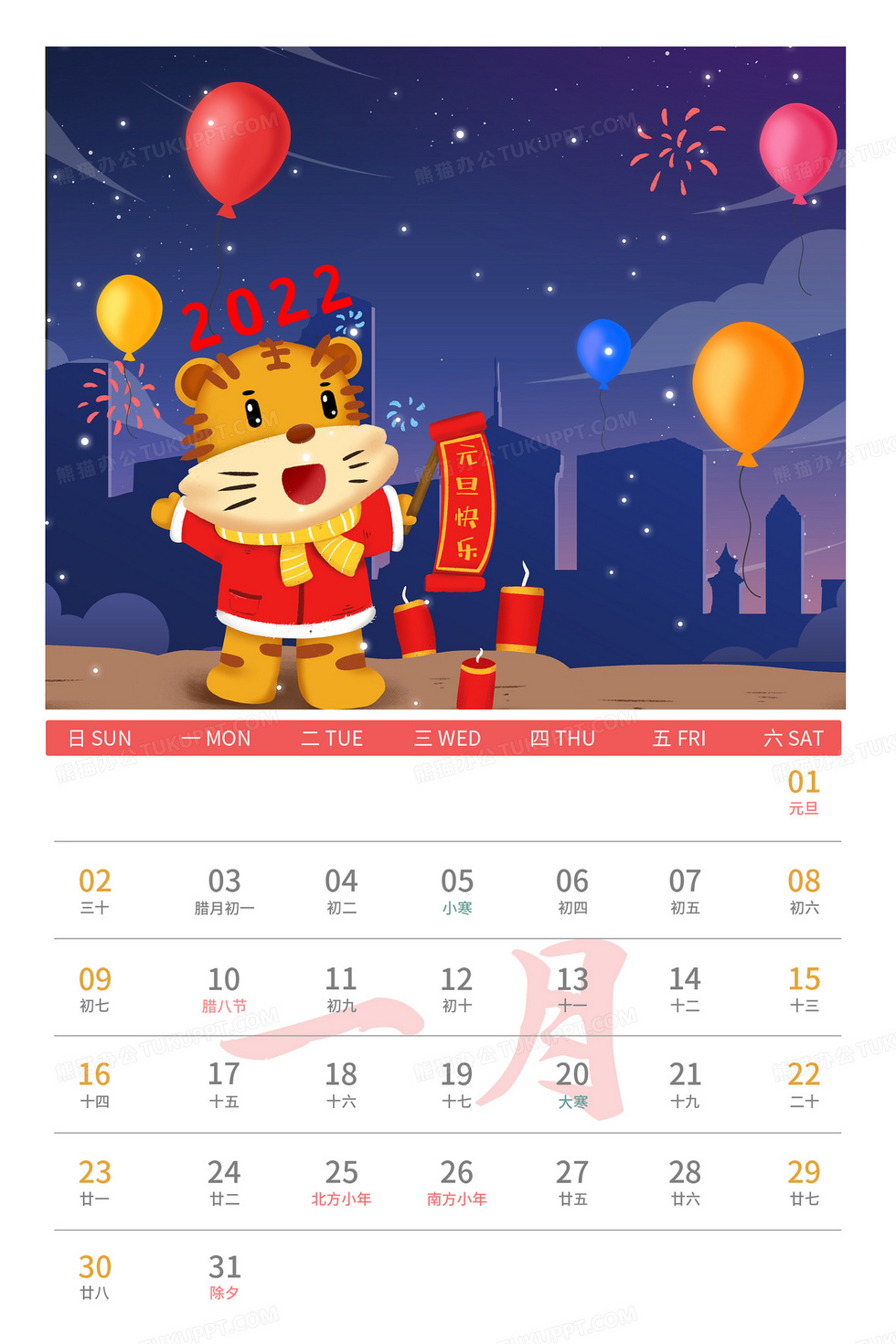 本作品内容为2022虎年日历一月份插画背景, 格式为 psd, 大小9 MB, 图片尺寸为3543 x 5315, 作品中背景图片无需修改, 源文件无水印,可以直接使用, 欢迎使用熊猫办公。 如认为平台内容涉嫌侵权,可通过邮件:tousu@tukuppt.com提出书面通知,我们将及时处理。