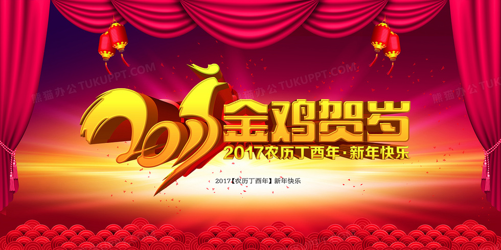 本作品内容为2017金鸡贺岁喜庆舞台大红海报背景素材, 格式为 psd, 图片尺寸为4016 x 2008, 作品中背景图片无需修改, 源文件无水印,可以直接使用, 欢迎使用熊猫办公。 如认为平台内容涉嫌侵权,可通过邮件:tousu@tukuppt.com提出书面通知,我们将及时处理。