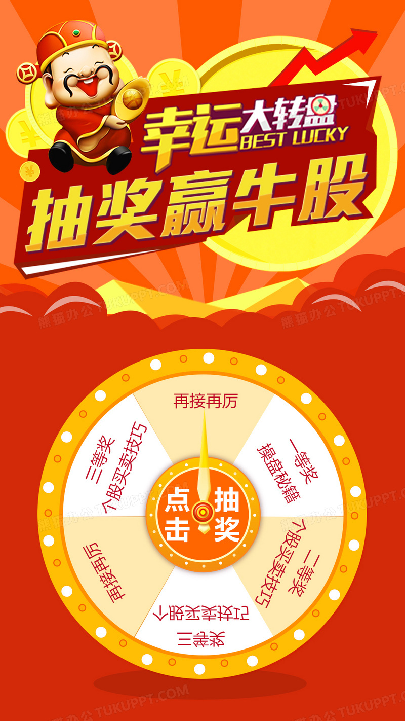本作品内容为幸运大转盘抽奖赢牛股H5背景psd下载, 格式为 psd, 图片尺寸为1080 x 1920, 作品中背景图片无需修改, 源文件无水印,可以直接使用, 欢迎使用熊猫办公。 如认为平台内容涉嫌侵权,可通过邮件:tousu@tukuppt.com提出书面通知,我们将及时处理。