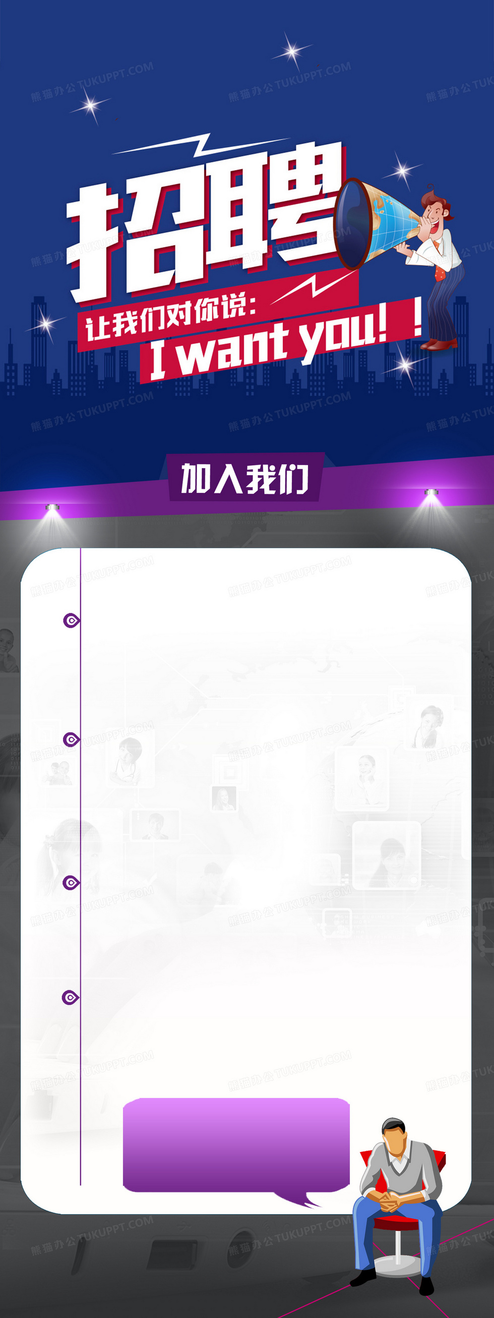 本作品内容为招聘展架, 格式为 psd, 图片尺寸为2101 x 5601, 作品中背景图片无需修改, 源文件无水印,可以直接使用, 欢迎使用熊猫办公。 如认为平台内容涉嫌侵权,可通过邮件:tousu@tukuppt.com提出书面通知,我们将及时处理。