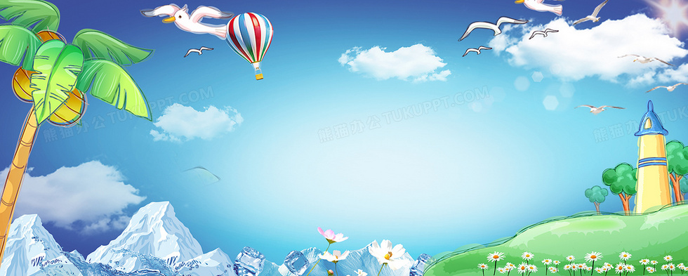 本作品内容为卡通夏季培训班蓝天背景素材, 格式为 psd, 图片尺寸为5564 x 2229, 作品中背景图片无需修改, 源文件无水印,可以直接使用, 欢迎使用熊猫办公。 如认为平台内容涉嫌侵权,可通过邮件:tousu@tukuppt.com提出书面通知,我们将及时处理。