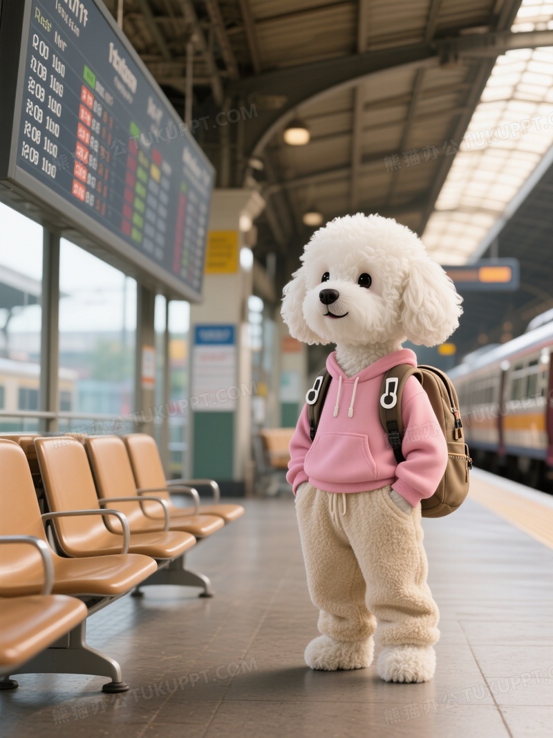 本作品内容为一只拟人化可爱比熊犬要外出旅游时在车站候车室观察车辆出发时间表的场景, 格式为 jpg, 大小1 MB, 图片尺寸为1104 x 1472, 源文件无水印, 欢迎使用熊猫办公。 如认为平台内容涉嫌侵权,可通过邮件:tousu@tukuppt.com提出书面通知,我们将及时处理。