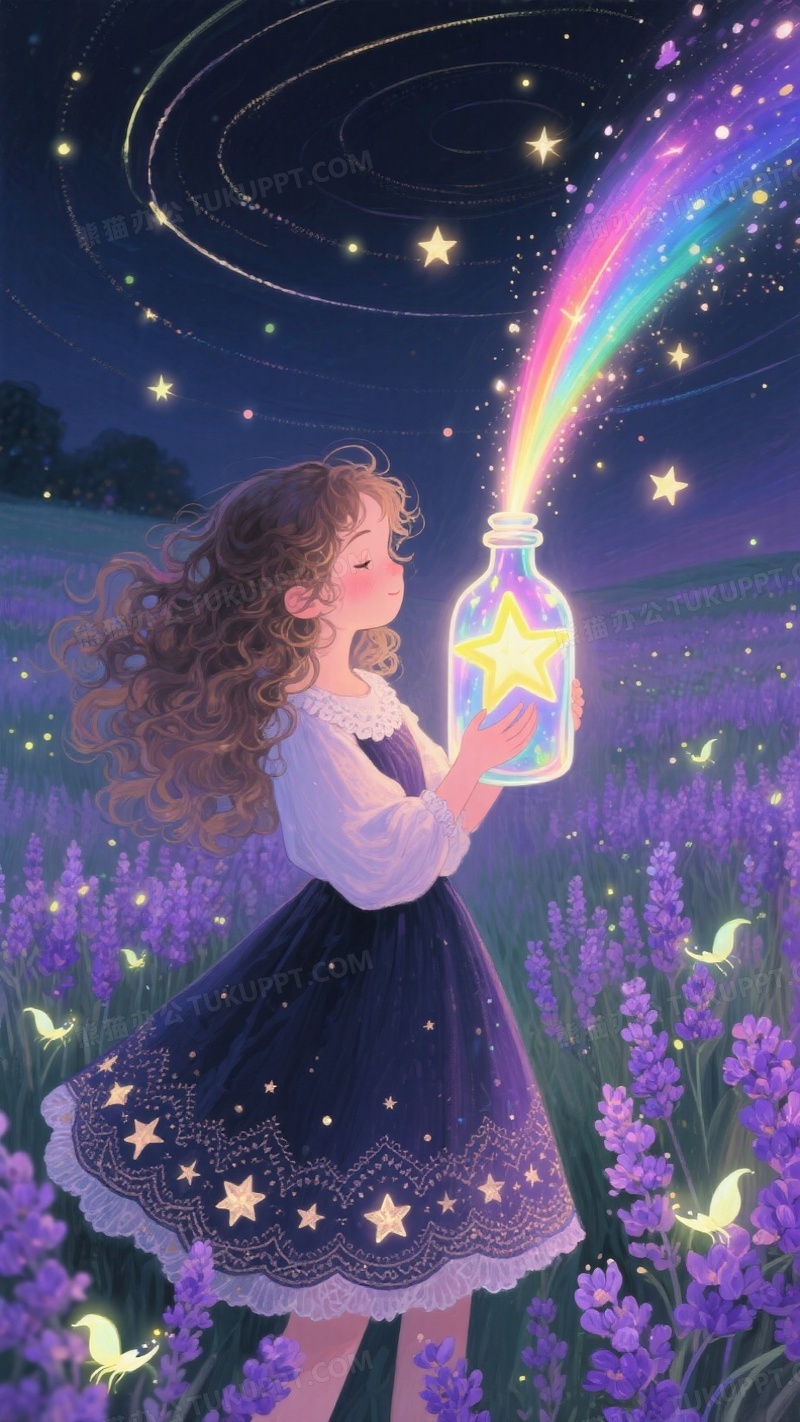 本作品内容为童话风发光手绘插画卷发女孩在薰衣草田捧星形许愿瓶, 格式为 jpg, 大小1 MB, 图片尺寸为936 x 1664, 源文件无水印, 欢迎使用熊猫办公。 如认为平台内容涉嫌侵权,可通过邮件:tousu@tukuppt.com提出书面通知,我们将及时处理。