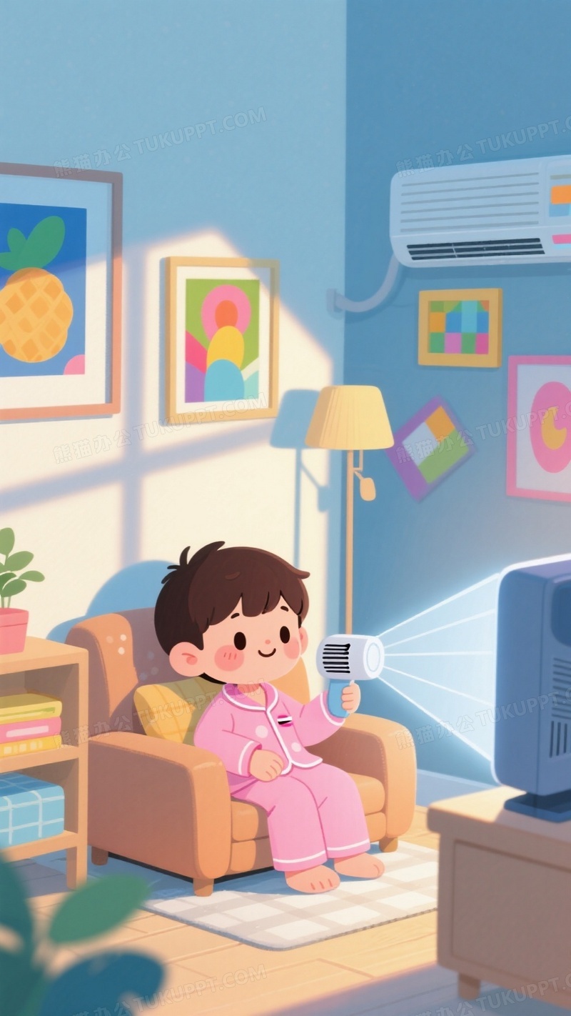 本作品内容为可爱风夏天卡通插画男孩穿着粉色睡衣在家中角落的小沙发上吹空调看电视, 格式为 jpg, 大小1 MB, 图片尺寸为936 x 1664, 源文件无水印, 欢迎使用熊猫办公。 如认为平台内容涉嫌侵权,可通过邮件:tousu@tukuppt.com提出书面通知,我们将及时处理。