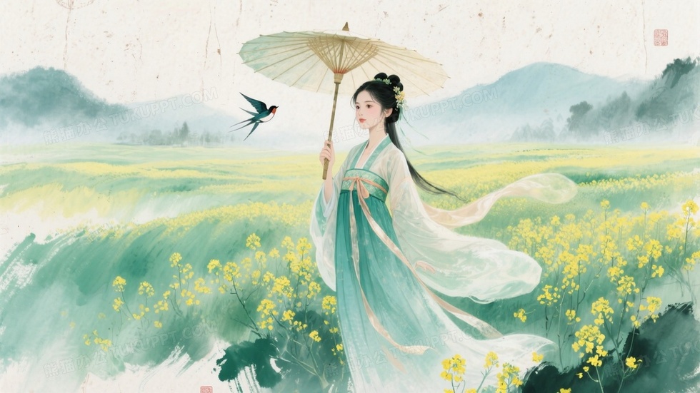 本作品内容为水墨融合油画笔触汉服少女执油纸伞立于油菜花田, 格式为 jpg, 大小1 MB, 图片尺寸为1664 x 936, 源文件无水印, 欢迎使用熊猫办公。 如认为平台内容涉嫌侵权,可通过邮件:tousu@tukuppt.com提出书面通知,我们将及时处理。
